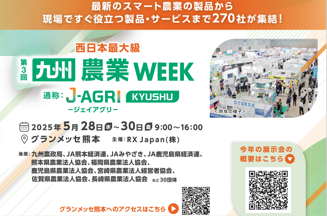 2025年5月28日(水)~30日(金)グランメッセ熊本で開催されるJ AGRI九州(旧 農業WEEK九州)に出展いたします。